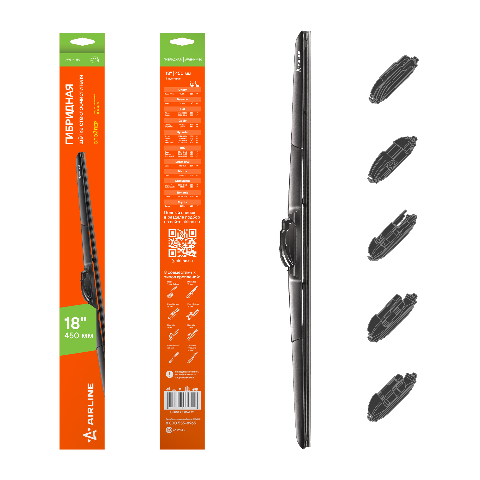 Гибридные щетки стеклоочистителя AIRLINE — это надежность и идеальная видимость в любую погоду. Благодаря сочетанию прочного каркаса и пластикового кожуха они равномерно прижимаются к стеклу, а аэродинамическая форма работает как спойлер, усиливая прижатие на высоких скоростях и обеспечивая стабильную очистку даже при боковом ветре. Резина выполнена по технологии Anti-age с частицами озона, что продлевает срок службы и сохраняет эластичность. Графитовое покрытие гарантирует мягкое, бесшумное скольжение без скрипов и повреждений стекла. В комплект входят пять адаптеров, подходящих для разных типов креплений, что делает щетки универсальными и удобными в установке. Они долговечны, обеспечивают надежное прилегание к стеклу и эффективны как в зимних, так и в летних условиях. Щетки стеклоочистителя AIRLINE — ваш выбор для чистого и безопасного обзора в любую погоду.